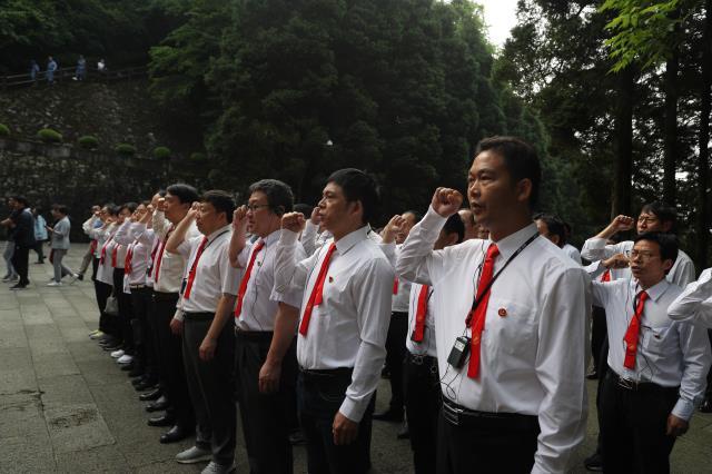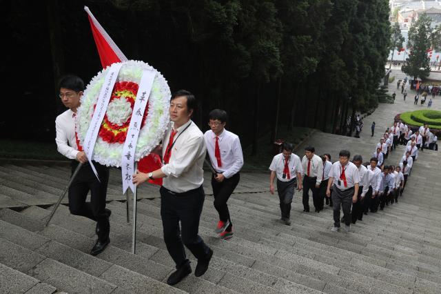 庄严肃穆的井冈山革命烈士陵园,松涛呜咽,苍柏含翠。学员们在校领导的带领下,踏着沉重的脚步,向数万名浴血井冈山、长眠于此的革命先烈们敬献花圈,鞠躬默哀,并现场聆听了一场特殊而生动的党课。在烈士陵园前,所有学员面朝鲜红的党旗,重温了入党誓词。熊百华是一名有着30多年党龄的老党员了,可是,这次在革命烈士陵园前重温入党誓词,依然给他带来了前所未有的冲击和震撼,“共产党员”这四个字更加的沉甸甸,熊百华表示,“革命先辈们用他们的牺牲和奉献完成了他们的责任和使命,而我们的责任和使命就是接过先烈手上的接力棒,为建设社会主义事业,为把井冈山大学建设成为特色鲜明的区域高水平大学而努力奋斗。”