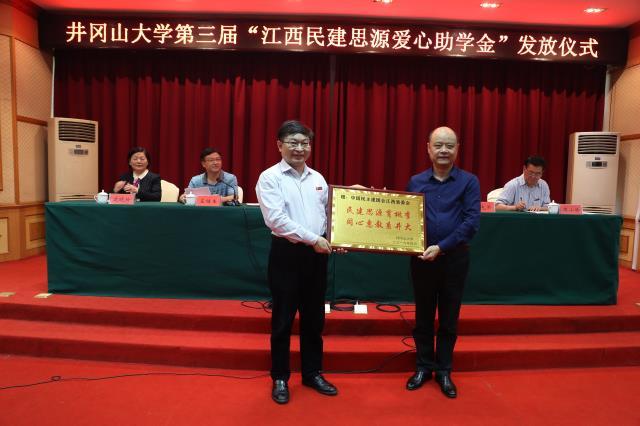 4月25日下午,井冈山大学第三届“江西民建思源爱心助学金”发放仪式在校举行,40名品学兼优的贫困大学生每人获5000元资助,江西省委会专职副主委赵波出席并讲话,党委副书记、校长曾建平代表学校向江西省民建同心扶贫基金会理事长李光荣赠送捐资荣誉锦牌,副校长左继生主持仪式,党委常委、副校长陈小林讲话,吉安市委会主委边晓玲等领导出席。出席仪式的领导和嘉宾为40名大学生颁发了助学金。获资助学生代表、人文学院倪小妍同学发了言。