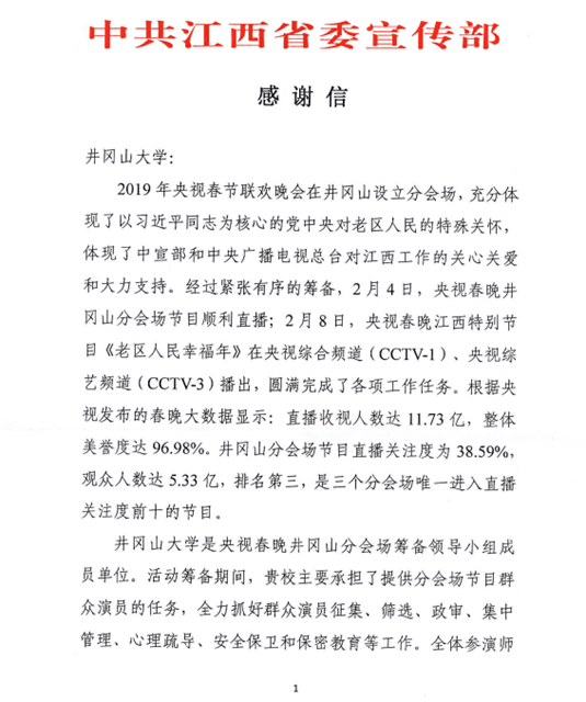近日,我校分别收到省委宣传部和省委教育工委、省教育厅的感谢信,信中对我校以实际行动传承弘扬井冈山精神,高质量高水平地圆满完成了央视春晚演出任务给予了衷心的感谢和充分的表扬。