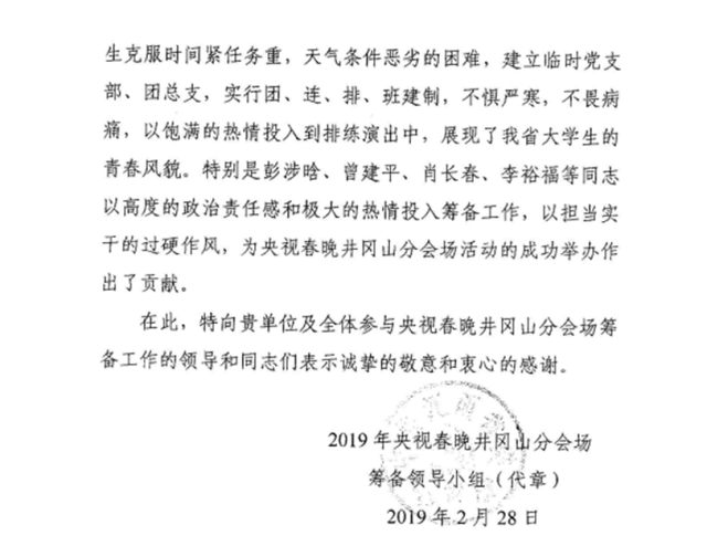 省委宣传部在感谢信中说,活动筹备期间,贵校主要承担了提供分会场节目群众演员的任务,全力抓好群众演员征集、筛选、政审、集中管理、心理疏导、安全保卫和保密教育等工作。全体参演师生克服时间紧任务重,天气条件恶劣的困难,建立临时党支部、团总支,实行团、连、排、班建制,不惧严寒,不畏病痛,以饱满的热情投入到排练演出中,展现了我省大学生的青春风貌。特别是彭涉晗、曾建平、肖长春、李裕福等同志以高度的政治责任感和极大的热情投入筹备工作,以担当实干的过硬作风,为央视春晚井冈山分会场活动的成功举办作出了贡献。