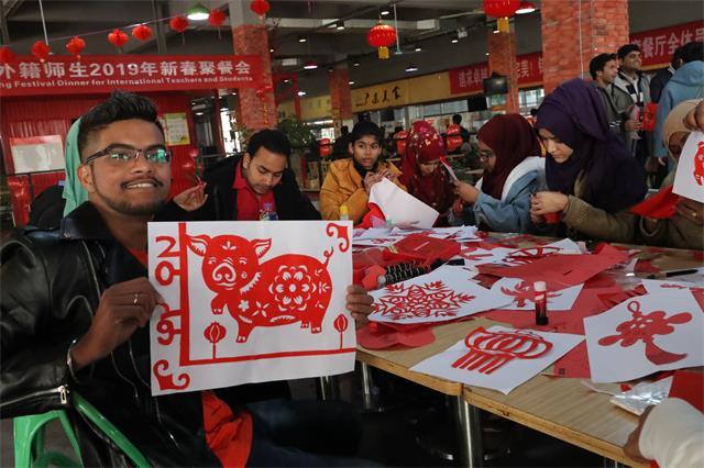 1月28日,是农历小年,我校300多名外国留学生齐聚一堂,提前过上了一个有浓浓年味的中国传统佳节。包饺子、写春联、剪纸,许多留学生以娴熟的技巧赢得了大家的由衷赞叹。当天下午,学校为300余名外国留学生举行了新春聚餐会,党委常委、副校长黄俭根以及有关部门负责人,与留校的外籍教师、留学生一起,共同欢度2019年新春佳节。