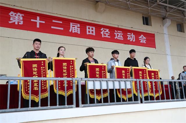 11月10日下午,井冈山大学第十二届田径运动会顺利闭幕。校党委书记彭涉晗,党委副书记肖长春,副校长左继生,党委常委、副校长吕玉华、黄俭根出席闭幕式并为获奖单位和个人颁奖。左继生致闭幕词,并宣布运动会闭幕。 经过三天的激烈角逐,医学部荣获学生甲组团体总分第一名,电子与信息工程学院、政法学院、建筑工程学院、人文学院、国际学院分别获得第二至第六名;体育学院18级运动训练本(1)班荣获乙组团体总分第一名,17运动训练本(1)班、18体育教育本(2)班、17体育教育本(2)班、16体育教育本(1)班、18社会体育指导与管理班分别获得第二至第六名;附属医院荣获教工组团体总分第一名,生命科学学院、医学部、外国语学院、电子与信息工程学院、机关一对分别获得第二至第六名;体育学院荣获第九套广播体操第一名,医学部、艺术学院、政法学院、外国语学院、商学院、机电工程学院、数理学院分别获得第二至第八名;体育学院荣获体育道德风尚特别奖,化学化工学院、生命科学学院、艺术学院、人文学院、外国语学院、国际学院荣获体育道德风尚奖;医学部、电子与信息工程学院、政法学院、建筑工程学院、教育学院、马克思主义学院荣获优秀组织奖。大会对获奖单位和个人进行了表彰。