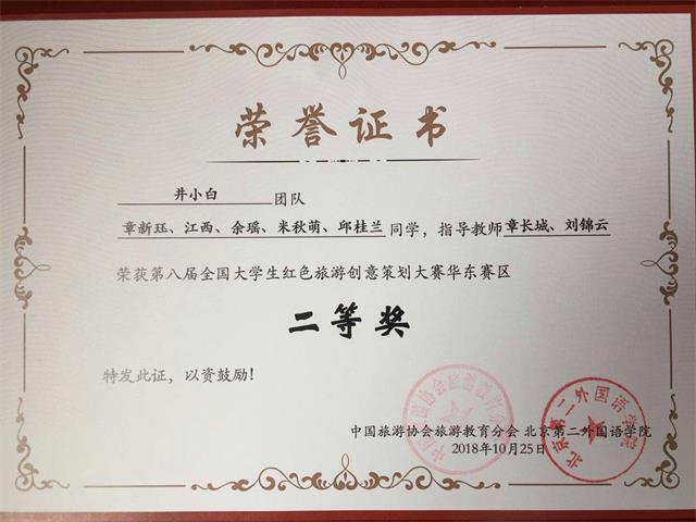 日前,第八届全国大学生红色旅游创意策划大赛落下帷幕,我校商学院“井小白”团队在华东赛区大赛中荣获二等奖,商学院获得优秀组织奖,章长城、刘锦云两位老师评为优秀指导老师。 据悉,本届大赛共有来自全国22个省、4个直辖市、1个特别行政区、4个自治区223所大学的682支团队参赛。大赛分东北、华北、西北、华中、华东、华南、西南等七个赛区进行评比,组委会专家一致认为本届参赛作品整体水平高,创意佳。各赛区参赛队伍排名前5%、20%、35%的团队分别获得赛区一、二、三等奖。