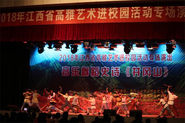 2018年江西省高雅艺术进校园活动由省教育厅、省文化和旅游厅、省财政厅主办,以“走进艺术,感受经典,陶冶情操,提升境界”为主题,共组织省内艺术院团到相关大中学校和社区演出60场,我校音乐舞蹈史诗《井冈山》承担了5场演出。 10月29日至11月2日,剧组先后来到江西服装学院、江西工业贸易职业技术学院、江西外语外贸职业学院、奉新一中、奉新四小,为万余名师生们带去了高雅艺术的熏陶,送上了深刻的井冈山精神洗礼。