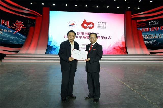 10月28日下午,学校举行仪式,聘请中国科学院院士、“嫦娥之父”欧阳自远为我校荣誉教授,校党委书记彭涉晗主持仪式,党委副书记、校长曾建平为欧阳自远院士颁发了荣誉教授证书,吉安市委常委、组织部长李镇发,校领导肖长春、左继生、吕玉华、史胜平、黄俭根、肖宜安、孙宜学等出席聘任仪式。