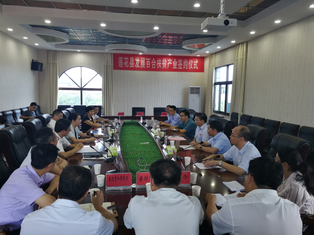 9月13日,我校与江西省莲花县人民政府、安徽省霍山县跃胜百合农民专业合作社三方合作发展百合扶贫产业签约仪式在莲花县举行。校党委副书记、校长曾建平,党委常委、副校长肖宜安,莲花县县委书记刘乡、县长张运来、常务副县长曾衍敏等出席仪式,莲花县副县长朱敏美、项目负责人胡雪华、跃胜合作社负责人刘胜东代表三方签约。