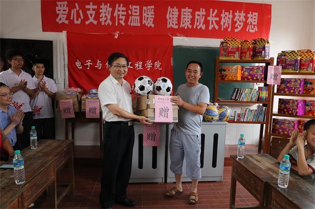 曾建平代表学校向塘尾村村小赠送了运动器材和图书