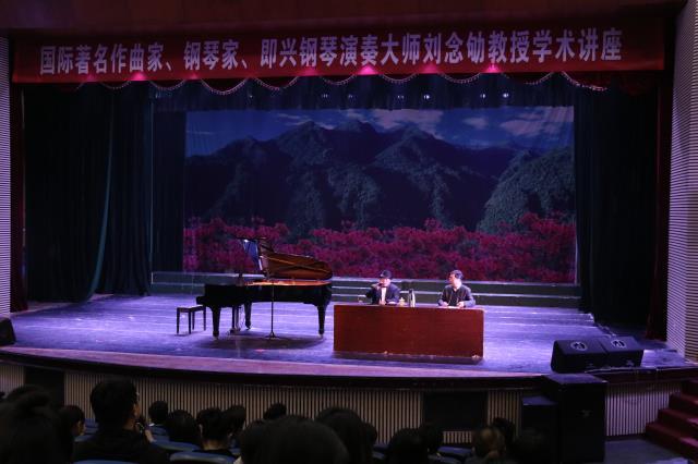 3月26日上午,刘念劬教授还为艺术学院师生举行了讲座,从西方音乐发展的脉络为主线带领大家温故了从巴洛克音乐——古典主义音乐的大师海顿、莫扎特、贝多芬到浪漫主义时期的舒伯特、肖邦、勃拉姆斯等,并讲述了自己的音乐之路。刘教授现场为学生们重现经典音乐《欢乐颂》、《圣桑的天鹅》、《小步舞曲》、《练习曲》等。展现钢琴即兴伴奏的美妙之处,为学生们即兴歌曲伴奏《映山红》等歌曲。这些经过即时改编的音乐既熟悉又陌生,学生在频繁的互动中兴趣得到激发,现场气氛热烈。