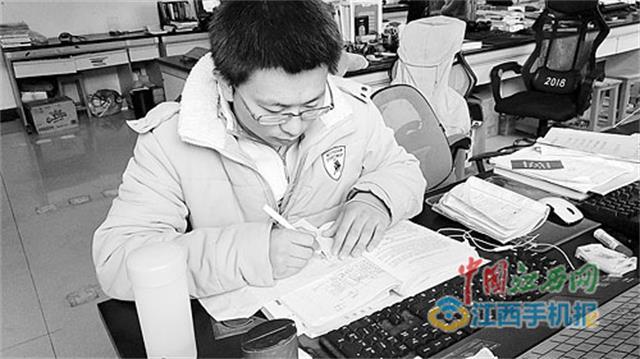 12月19日,井冈山大学十栋数理教学楼B区512室座无虚席,一处角落不显眼的位置,一位戴眼镜的学生正在埋头做题,从早上6点起,他已在位置上坐了近四个小时。