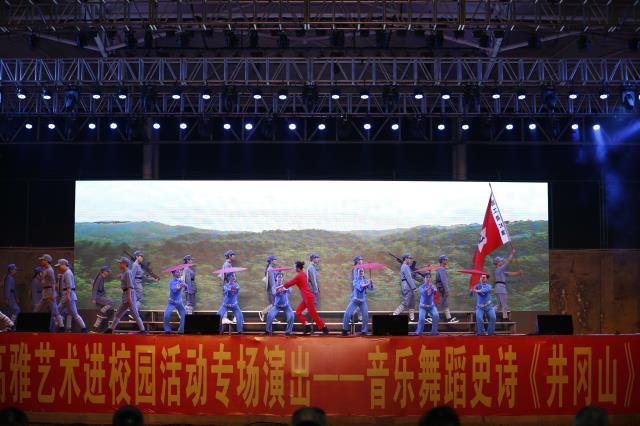音乐舞蹈史诗《井冈山》剧组连续六天在南昌、宜春、九江的六所学校演出,充分发扬了“艰苦奋斗、勇于胜利”的井冈山精神,同时也将井冈山革命斗争史、井冈山精神,通过艺术化的诠释,撒播到了更大的范围,让更多的青年学子和教师接受了洗礼。(郭伟清)