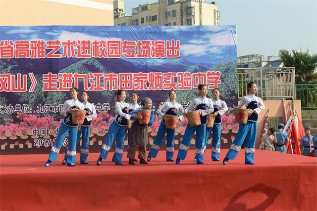 11月3日下午,音乐舞蹈史诗《井冈山》剧组走进九江田家炳实验中学,为该校1700余名师生带去了一场融合音乐、舞蹈、情景剧等表演形式为一体的艺术盛宴,同时也标志着2017年高雅艺术进校园——音乐舞蹈史诗《井冈山》全省巡演圆满收官。 10月28日下午,音乐舞蹈史诗《井冈山》剧组召开出征动员会,副领队彭一敏、杨芳分别做动员讲话,他们说,音乐舞蹈史诗《井冈山》是第五次入选江西省高雅艺术进校园经典剧目,同学们要充分发扬井冈山精神,不辱使命,以良好的精神面貌和演出状态接受观众检阅,为学校赢得荣誉。