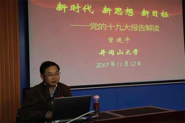 曾建平首先回顾了党的十九大盛况,然后从党的十九大的主题和主要成果、中国特色社会主义进入新时代、习近平新时代中国特色社会主义思想、新时代中国特色社会主义奋斗目标等方面,对党的十九大精神进行了系统、全面、深入的讲解。