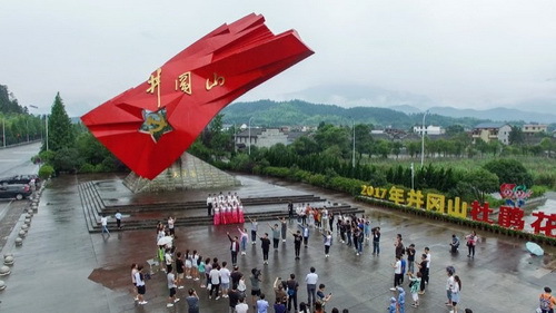 6月26日下午,在井冈山的特色标志——高速入口处的红旗雕塑广场,突然军号响起、军歌嘹亮,成了一片歌声、舞蹈与欢呼声的海洋,吸引了大批游客驻足。 原来,我校70余名大学生克服了考试季的压力,经过连续多日的紧张彩排,正以“军歌快闪”的形式,与来往井冈山的游客们,在这里进行了一场别开生面的特别互动。嘹亮的军号声划破了沉寂,循着军号声,在此拍照的游客们迅速被吸引住。随后,三五成群的井大学子们,以弦乐、管乐、合唱、舞蹈等艺术形式轮番表演,合作完成了《中国人民解放军军歌》、《人民军队忠于党》两首精心挑选的军歌快闪活动。