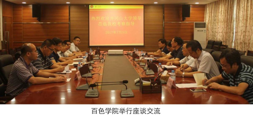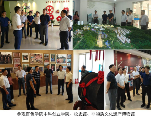 7月5日上午,彭涉晗一行与百色学院党委书记唐拥军、副校长徐魁峰、党办、宣传部、中科创业学院等部门负责人进行了友好座谈,双方就党建与思想政治工作特别是利用红色资源融入党建与思政工作作了深入探讨。期间,考察组一行在唐拥军书记的陪同下实地参观了百色学院中科创业学院、校史馆等,详细了解了百色学院中科创业学院的运作模式、大学生创业孵化基地、众创空间等情况。