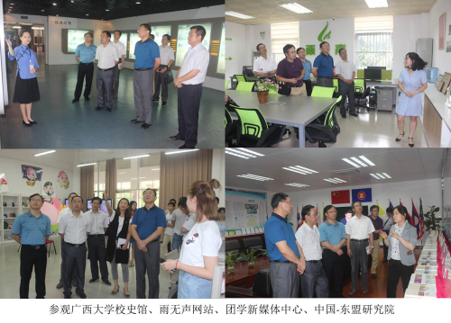 7月4日上午,彭涉晗一行与广西大学党委副书记查丹明,副校长罗廷荣及宣传部、学工部、校友办等部门负责人进行了友好座谈,双方就党建与思想政治工作、思政教学改革、辅导员职业发展、校史馆建设、校庆筹备等进行了深入交流。7月3日下午,考察组一行实地参观了广西大学校史馆、雨无声网站、团学新媒体中心、中国-东盟研究院。期间,彭涉晗与广西大学党委书记刘正东进行了会谈。