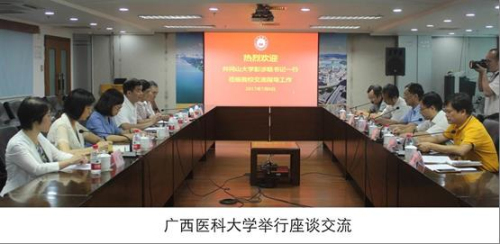 7月6日上午,彭涉晗一行与广西医科大学党委副书记韦安光、副校长何并文、宣传部、组织部、党办校办、新闻中心等部门负责人进行了友好座谈,双方就党建、思想政治工作、校庆组织策划、校园建设和校园人文景观建设等方面开展了深入交流和探讨。座谈会后,考察组一行在何并文副校长的陪同下参观了广西医科大学校史馆等场所。期间,彭涉晗与广西医科大学党委书记仇小强进行了会谈。