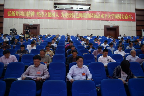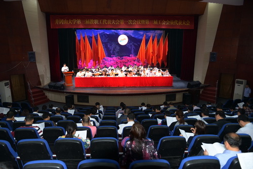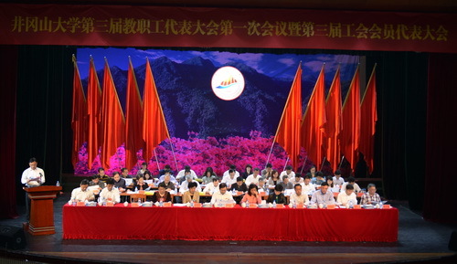 4月8日上午,第三届教职工代表大会第一次会议暨第三届工会会员代表大会隆重开幕。155名正式代表出席会议,部分列席代表列席会议。江西省总工会巡视员林玉华代表省总工会、省教育工会对会议的召开表示热烈的祝贺,她在讲话中充分肯定了我校工会工作成绩,同时对我校工会组织提出了殷切希望和要求。吉安市委常委、市总工会主席肖玉兰,省教育工会常务副主席吴艳玲,吉安市总工会副主席周密到会指导。校党委书记彭涉晗在北京学习,对大会的成功召开表示热烈祝贺。校领导曾建平、肖长春、左继生、桂国庆、龙进、吕玉华、史胜平、陈小林、黄俭根、肖宜安、苗夺谦出席会议,并在主席台前排就坐。本次大会会期两天,主要任务是:审议通过学校工作报告,审议通过学校财务工作报告,审议通过工会工作报告,审议通过工会经费审查报告,听取提案工作报告,审议通过《井冈山大学关于应用转型发展的意见》,通过教代会提案工作委员会组成人选,选举产生井冈山大学第三届工会委员会,选举产生井冈山大学第三届工会经费审查委员会。 在第一次全体会议上,党委副书记、校长曾建平作学校工作报告,副校长左继生致开幕词,党委常委、副校长龙进主持,校长助理苗夺谦作《井冈山大学关于应用转型发展的意见》起草情况的说明,史进保同志作学校财务工作报告,康云峰同志作工会工作报告,曾桂群同志作提案工作报告。