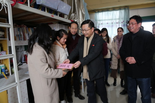 1月10日,校党委书记彭涉晗,党委副书记、校长曾建平,党委常委、副校长陈小林,分别在有关部门负责人陪同下,深入学生宿舍,走访慰问了贫困学生代表。 校领导和贫困学生亲切交谈,详细询问了贫困学生的学习和生活情况,仔细了解了他们的家庭基本情况、主要经济来源和面临的实际困难。校领导为贫困学生送去了慰问金和慰问信,勉励他们树立远大志向,确立奋斗目标,克服暂时困难,自强自立,努力学习,早日成才。