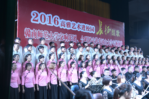 11月14日晚,由江西省教育厅主办的“2016年高雅艺术进校园—赣南师范大学交响乐团、合唱团专场演出”在我校举行。赣南师范大学党委副书记胡龙华,赣南师范大学党委委员、宣传部长郭厚文,我校党委副书记肖长春,以及我校师生1000余人观看了演出。 由赣南师范大学交响合唱团带来的长征组歌——《红军不怕远征难》。以深刻凝练的语言、优美动人的曲调,浓郁的民族风格和为群众喜闻乐见的艺术表演形式,讴歌了中国工农红军在党中央毛主席的领导下,不屈不挠、无私无畏的革命精神,歌颂了红军指战员艰苦卓绝、英勇奋战的英雄气概。颂扬了中国革命史中具有传奇色彩的二万五千里长征。