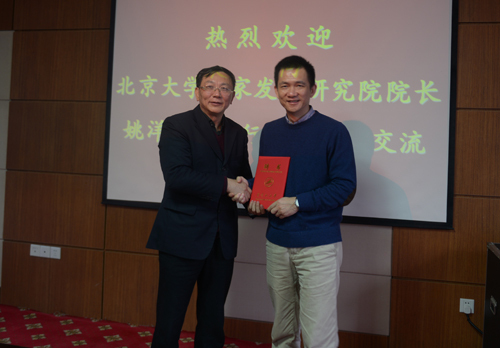 11月18日上午,学校举行仪式,聘请北京大学国家发展研究院院长姚洋教授为我校客座教授。校党委书记彭涉晗代表学校向姚洋教授颁发了聘书,副校长桂国庆主持受聘仪式,副校长陈小林出席,学校相关部门负责人参加了受聘仪式。