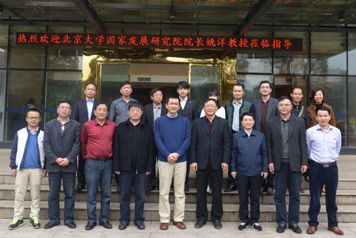 受聘仪式后,学校举行了座谈会,彭涉晗代表学校对姚洋一行来校调研交流表示热烈欢迎。他向姚洋教授一行简要介绍了我校办学情况。姚洋教授介绍了北京大学国家发展研究院的师资队伍和科研情况。双方就井冈山大学的进一步发展进行了热情友好的交流,并就依托北京大学国家发展研究院的学科优势,建立实习实践基地、设立教师进修项目等方面进行了深入探讨,达成了初步合作意向。