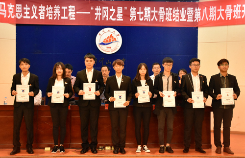 10月25日下午,我校青年马克思主义者培养工程——第七期“井冈之星”大骨班结业暨第八期大骨班开班仪式顺利举行。校党委副书记肖长春出席并为第八期大骨班授旗,学校有关部门负责人及第七、八期大骨班全体学员参加开班式。 开班式上,肖长春向第七期“大骨班”顺利结业的同学们表示祝贺,向即将开启新征程的第八期“大骨班”的学员们表示祝愿。他指出,高校是育人的重要阵地,必须坚持不懈地用马克思主义中国化的最新成果武装青年,用社会主义核心价值观教育青年,通过教育培训和实践锻炼等行之有效的方式,不断提高青年群体的思想政治素质,使他们进一步掌握马克思主义基本原理和马克思主义中国化的一系列理论成果,进一步加深对我国国情及形势政策的了解,进一步坚定跟党走中国特色社会主义道路的理想信念。肖长春要求,全体“大骨班”学员要树立一种精神追求,真信马克思主义;要崇尚一种信念境界,真学马克思主义;要锤炼一种品格意志,真懂马克思主义。希望同学们通过在培养班的理论学习和实践锻炼,不断提高理论水平和工作能力,努力成长为用马克思主义中国化的最新成果武装头脑的青年马克思主义者。