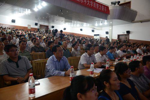 9月23日下午,著名军事战略专家、国防大学教授、战略学博士生导师、我校荣誉教授金一南少将专程来校举办了一场《新挑战、新机遇、新举措——国家安全形势与安全筹划》的学术报告,会场上座无虚席、气氛活跃,报告取得了圆满成功。校党委书记彭涉晗主持,在家的校领导肖长春、桂国庆、吕玉华、史胜平、陈小林、黄俭根、肖宜安出席报告会,学校师生以及部分吉安市直单位负责人和武警吉安市支队官兵1400余人聆听了报告。 金一南从全球战略思维出发,紧扣历史与现实,结合当前与长远,用生动事例全面分析了当前国家在南海、东海等面临的安全形势和种种挑战,深刻揭示了当今国际政治上存在的深层次问题,并结合自身多年研究成果和实践经验,围绕党的十八届三中全会作出的重大决定,深入阐述了我们实现中华民族伟大复兴所必须具备的战略思维、战略规划。在两个多小时的精彩报告中,金一南将军以其风趣幽默的语言、丰富渊博的学识、宏大开阔的格局征服了现场的听众,赢得了阵阵热烈的掌声。