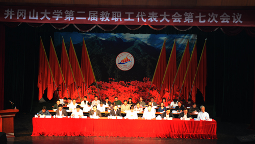 5月20日下午,第二届教职工代表大会第七次会议在雄壮的国歌声中隆重开幕。136名正式代表出席会议,部分列席代表列席会议。校领导彭涉晗、曾建平、肖长春、桂国庆、吕玉华、史胜平、陈小林、黄俭根、肖宜安、苗夺谦出席会议,并在主席台前排就坐。本次大会会期两天半,主要任务是:听取和审议学校工作报告,听取和审议学校财务工作报告,听取和审议提案工作报告,审议通过《井冈山大学“十三五”发展规划》,审议通过井冈山大学校训,审议通过《井冈山大学岗位设置及人员聘用实施方案》,审议通过《井冈山大学实施岗位绩效工资暂行办法》,审议通过《井冈山大学专业技术资格条件(主系列)》。 在第一次全体会议上,校长曾建平作学校工作报告,党委副书记肖长春主持,副校长桂国庆致开幕词。贺晓斌作学校财务工作报告,刘梁军作提案工作报告,昌庆钟作“十三五”规划编制说明,郭新春作校训方案说明。