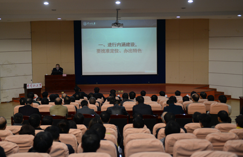 1月5日下午,学校举行2016年第一期井冈山大学发展论坛,邀请了广东省科协主席、中山大学原校长、博士生导师黄达人教授来校,就内涵建设作专题报告。校党委书记彭涉晗出席,校长曾建平主持论坛报告会,在家的校领导肖长春、桂国庆、吕玉华、史胜平、陈小林、苗夺谦等出席,全校处级干部以及教师代表听取报告。