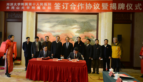 1月29日下午,同济大学附属第十人民医院和井冈山大学附属医院签订合作协议暨揭牌仪式在吉安宾馆隆重举行。同济大学党委书记杨贤金,吉安市市长王少玄、井冈山大学党委书记彭涉晗、井冈山大学校长曾建平、吉安市副市长左继生、井冈山大学校长助理苗夺谦、同济大学附属第十人民医院院长秦环龙等出席仪式,校纪委书记史胜平主持仪式。杨贤金、曾建平、秦环龙分别讲话,秦环龙和井冈山大学附属医院院长曾常爱分别代表双方签订合作协议。井冈山大学附属医院同时挂牌同济大学附属第十人民医院分院,杨贤金、王少玄、彭涉晗、秦环龙共同为同济大学附属第十人民医院分院揭牌。同济大学有关部门负责人、同济大学附属第十人民医院有关负责人及部分科室负责人、井冈山大学附属医院负责人等参加了仪式。