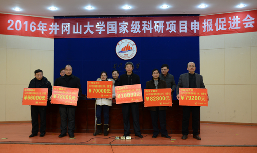 23项2015年国家级科研项目获学校奖励176.48万元 12月29日,学校举行2016年国家级科研项目申报促进会。校长曾建平出席并讲话,副校长桂国庆主持,副校长陈小林作2015年国家级科研项目申报情况总结。各学院院长、分管科研副院长,2015年获批国家基金项目的负责人,各学科负责人、具有博士学位及副教授以上职称人员等参加了会议。校领导为23项2015年国家级科研项目的主持人颁发科研项目奖励共176.48万元。商学院白竹岚博士和数理学院叶子飘教授分别介绍了成功申报国家社科基金项目和国家自科基金项目经验,化学化工学院副院长隋岩教授介绍了化学化工学院国家级科研项目申报组织经验。