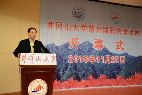 11月25日,第六届“同济学术周”开幕式在校隆重举行。同济大学党委副书记、纪委书记姜富明致辞,我校党委书记彭涉晗出席,校长曾建平致辞。校党委副书记肖长春出席,副校长桂国庆主持开幕式,在家的校领导王伴青、吕玉华、史胜平出席。原同济大学常务副校长李永盛,原同济大学副校长赵建夫,我校原校长助理、同济大学刘春教授,我校原校长助理、同济大学张氢教授出席了开幕式。参加开幕式的还有同济大学有关部门、学院专家,以及我校各部门、学院、单位主要负责人,分管教学、科研的副院长,以及教师代表、学生代表共计300余人。 曾建平说,本届“同济学术周”开展,适逢同济大学对口支援井冈山大学十周年。十年来,两校围绕“三个行动计划和共演一台戏”的工作目标,在本科教学、学科建设、教师进修、人才培养、科研合作、管理提升等方面,开展了大量工作。“同济学术周”活动举办以来,同济大学各位专家学者崇尚科学的精神、严谨治学的态度、潜心学问的热情、追求卓越的品质,使井冈山大学师生深受感染、倍受鼓舞。学术周活动的开展,为提升井冈山大学的科研能力和学术水平,倡导科学精神,浓厚学术氛围,提升学术素养,发挥了重要作用。通过学术周活动,也进一步促进了两校的往来交流,加深了两校师生的友谊,有力推动了对口支援工作发展。