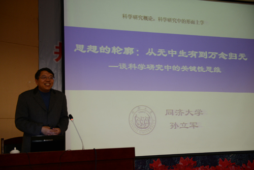 11月25日,第六届“同济学术周”举行了2场主题报告,同济大学交通运输工程学院孙立军教授作了题为《思想的轮廓:从无中生有到万念归无——谈科学研究中的关键性思维》的主题报告,同济大学环境科学与工程学院、嘉兴同济环境研究院院长赵建夫教授作了题为《可持续发展与高等教育》的主题报告。同济大学党委副书记、纪委书记姜富明,井冈山大学校领导彭涉晗、曾建平、肖长春、桂国庆、王伴青、吕玉华、史胜平,原同济大学常务副校长李永盛,我校原校长助理刘春教授、张氢教授,以及我校各部门、学院、单位主要负责人,分管教学、科研的副院长,以及教师代表、学生代表共计300余人听取了主题报告。发展规划研究室主任昌庆钟主持报告会。 孙立军结合自身多年的科学研究经验和近代以来科学发展的演进历程,再次验证了建构主义理论的科学性。报告逻辑严谨、论证充分、思路缜密,为学校和教师的科研创新和人才培养改革提供了参考和借鉴作用。