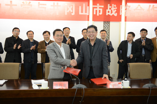 11月18日上午,我校与井冈山市政府战略合作协议签订仪式在井冈山市举行。校党委书记彭涉晗出席,校长曾建平致辞,吉安市委常委、井冈山管理局党工委书记、井冈山市委书记龙波舟出席,井冈山管理局局长、井冈山市市长陈敏讲话,副校长陈小林与井冈山市副市长巫太明分别代表双方签约,井冈山市委常委、政法委书记、农工部部长张伟主持签约仪式,我校相关部门、学院负责人和井冈山市委、市政府有关部门负责人参加了签约仪式。