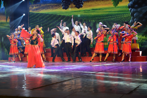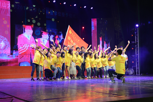 在欢快的结束曲中,校领导以及部分校友代表走上舞台,祝贺演出成功,并和演员合影留念。