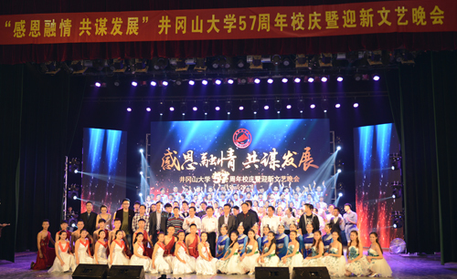 10月28日晚,学校隆重举行“感恩融情 共谋发展”57周年校庆暨迎新文艺晚会。校党委书记彭涉晗、校长曾建平、校党委副书记肖长春、副校长桂国庆、陈小林等出席观看了晚会。来自北京、上海、广州、深圳、南昌和吉安等全国各地的校友代表以及全校处级干部和师生代表共1400余人一起观看了演出。 晚会开篇视频通过一组组老照片回顾了井冈山大学创办57年来,在各级领导和社会各界的关心支持下,历任领导和历届师生坚持以井冈山精神办学育人,苦练内功、借助外力、开拓进取、奋勇攀登,使学校不断蓬勃发展和壮大的历史。