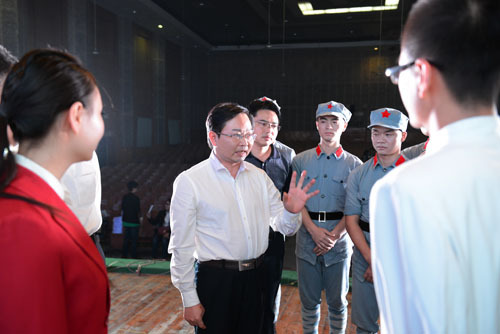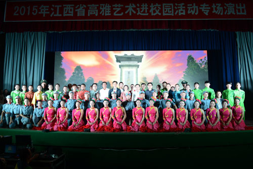 演出结束后,曾建平、叶观荣等领导上台慰问了演职人员并合影留念。曾建平对演出成功表示祝贺并提出了希望,他说,今晚的演出非常成功,大家充分发扬了艰苦奋斗的井冈山精神,希望在今后的学习和工作中,大家再接再厉,要利用巡演的机会,充分向各兄弟高校学习,不断丰富艺术形式,努力增强作品表现力,创作出更多艺术精品。