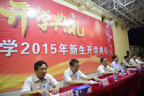 9月9日晚,学校隆重举行2015级新生开学典礼暨军训动员大会。因公在外出差的校党委书记彭涉晗委托校领导,向顺利入学的4300余名新生表示祝贺和欢迎。校长曾建平讲话,党委副书记肖长春主持,副校长桂国庆、王伴青、吕玉华,纪委书记史胜平出席,学校有关职能部门主要负责人,各学院党政负责人,各学院教务科、学生科负责人,2015级全体班主任、辅导员, 2015级任课教师代表,以及2015级全体新生等近5000人参加了大会。