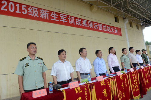 9月25日,2015级新生军训成果展示暨总结表彰大会举行,为期16天的新生军训工作圆满结束。校党委书记彭涉晗、党委副书记肖长春、副校长桂国庆、王伴青、吕玉华、纪委书记史胜平,以及武警吉安市支队支队长陈雄斌、副支队长徐雄伟、参谋长张国发等出席,并为优秀连和优秀排颁奖。彭涉晗代表学校向吉安市武警支队赠送了“言传身教展军姿,军校共建育栋梁”的锦旗,肖长春作总结讲话。