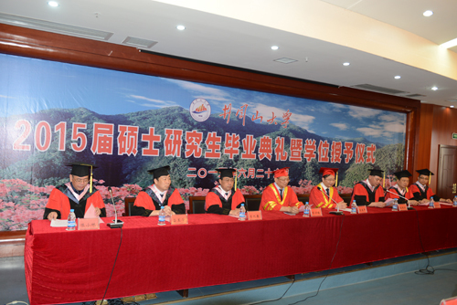 6月26日,我校2015届硕士研究生毕业典礼暨学位授予仪式隆重举行。校党委书记彭涉晗,校长曾建平,党委副书记肖长春,副校长桂国庆、吕玉华,纪委书记史胜平,副校长陈小林,校长助理张氢,出席毕业典礼并为25名圆满完成社会工作专业的硕士研究生颁发毕业证书,授予硕士学位。曾建平致辞,桂国庆主持,陈小林宣读2015届社会工作硕士研究生毕业生的决定和授予社会工作硕士学位的决定。校内外硕士生导师、毕业生家长、家属代表以及有关学院、职能部门负责人和教师代表参加了毕业典礼。曾建平以《有担当才有希望》为题,发表了热情洋溢的讲话。