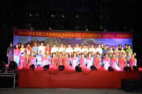6月17日晚,全省高雅艺术进校园——音乐舞蹈史诗《井冈山》专场演出在赣南医学院举行。赣南医学院党委书记黄林邦,校长韩立民,党委副书记陈新,副校长刘潜、刘民出席观看。我校校长张泰城,副校长吕玉华出席观看。赣南医学院1000余名师生观看了演出。演出前,韩立民、张泰城分别致辞。 当晚的演出在赣南医学院的操场上露天举行,师生们闻讯纷纷从四面八方赶来观看。演出在赣南医学院师生中引起了强烈的反响,赣南医学院的领导和师生们对节目的思想性、艺术性和感染力赞不绝口。