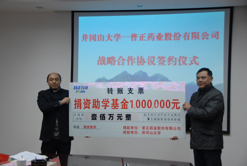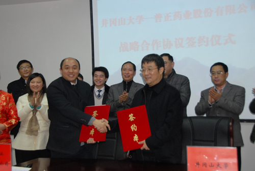 12月16日,我校与江西普正药业股份有限公司签订了战略合作协议。校长张泰城、江西普正药业股份有限公司董事长肖军平分别致辞,并签署校企合作战略协议,国家井冈山经济技术开发区党工委书记刘志坚出席。副校长桂国庆介绍了校企合作主要内容,副校长肖长春主持。江西普正药业股份有限公司捐资100万元在我校设立奖助学基金仪式同时举行,肖军平代表企业捐赠100万元人民币支票,桂国庆接受捐赠。普正药业有关部门负责人以及学校有关部门负责人参加了仪式。