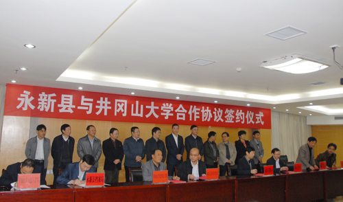 张泰城指出,学校十分重视将自身的学科优势与地方特色和地方经济发展需要有机结合,主动为地方经济和社会发展服务,开展了一系列校县、校企科技合作并取得成效。双方无论在工业企业的技术攻关上、还是在红色、古色、绿色旅游资源保护开发上,都有广阔的合作前景。积极为永新县经济社会发展提供技术和智力支持,支持永新的发展是井冈山大学义不容辞的责任。这次合作,既为永新县的经济社会发展提供一定帮助,又能使井冈山大学服务社会的能力得到进一步提升。双方从实际出发,坚持优势互补、资源共享的原则,同心同德,创造性地开展工作,必将取得丰硕的成果。