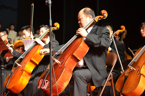 音乐会在全场合唱《东方红》的歌声中结束。两校领导走上舞台,向参演师生祝贺演出成功,并与他们合影留念。