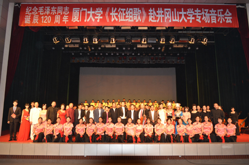 为纪念毛泽东同志诞辰120周年,10月26日晚,由井冈山大学和厦门大学联合主办、厦门大学合唱团演唱和厦门大学交响乐团演奏的专场音乐会《长征组歌》,在校隆重举行。厦门大学党委副书记林东伟,井冈山大学校长张泰城、党委副书记金桂英、副校长肖长春、吕玉华等出席。出席晚会的还有厦门大学有关部门的领导和部分老师,江西经济管理干部学院副院长刘光华,以及吉安市委宣传部、市社联负责人等。张泰城致辞。我校1500名师生到场聆听了音乐会。