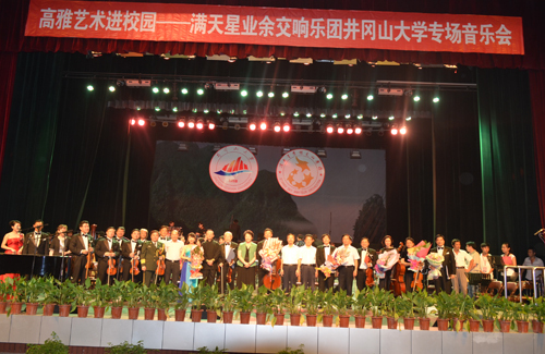 6月30日晚,我校学生会堂内座无虚席,满天星业余交响乐团专场音乐会在这里隆重上演。作为由教育部、文化部、财政部联合举办的全国“高雅艺术进校园活动”一部分,满天星业余交响乐团携手井冈山大学大学生合唱团、井冈山大学交响乐团以及南昌大学爱乐乐团,在中国共产党成立92周年之际,用心演唱和演奏每一个音符,用音乐表达对党对祖国对人民的无限热爱,将和谐、向上、团结、奋进的正能量通过高雅艺术进校园活动传递,为我校1500名师生带来了一场高雅的音乐盛宴。