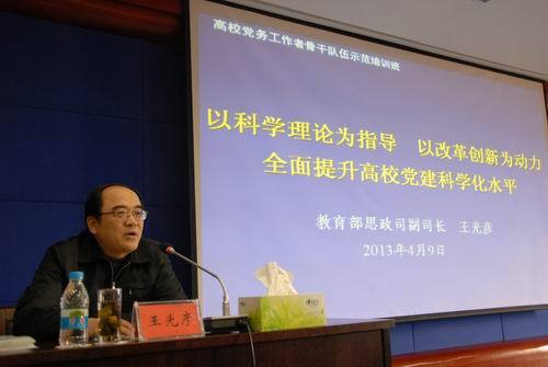 4月9日上午,教育部思政司副司长王光彦为全国高校院系分党委(党总支)书记示范培训班全体学员作了一场题为《以科学理论为指导,以改革创新为动力,全面提升高校党建科学化水平》的专题报告。我校党委副书记、纪委书记金桂英,副校长肖长春等聆听了报告。