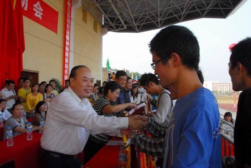 10月26日下午,为期三天的运动会圆满结束。在校的领导万继抗、金桂英、王伴青出席了闭幕式,各学院主要负责人在主席台就座。党委副书记金桂英致闭幕词并宣布井冈山大学第六届田径运动会闭幕。本届运动会组委会副主任委员彭勇宣读了群众体育工作先进集体名单、阳光体育活动先进集体名单、第九套广播体操获奖名单,运动会组委会委员习军明宣布了体育道德风尚奖、体育道德风尚特别奖、优秀组织奖获奖单位名单,赛事主管王玮宣布了竞赛成绩。18个学院的运动员代表列成整齐的方阵,接受了校领导的检阅。 金桂英在致辞中代表学校对积极参加本次运动会的全体运动员致以崇高的敬意,向在比赛中取得优异成绩的各代表队和运动员表示热烈的祝贺,向为本届运动会付出辛勤汗水的裁判员和全体工作人员表示衷心的感谢。