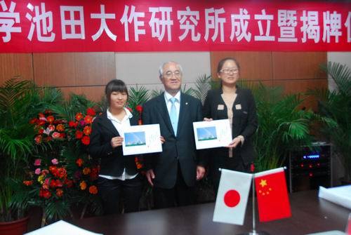 池田大作发表书面致辞 校长张泰城和日本创价大学校长山本英夫揭牌