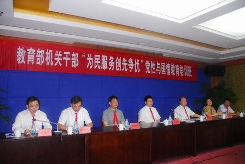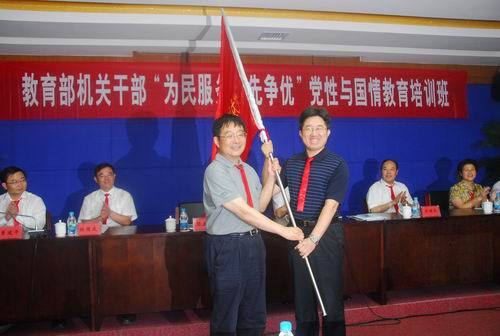 6月15日上午,教育部机关干部“为民服务创先争优”党性与国情教育专题培训班在我校开班。教育部机关党委组织宣传处处长郭宇光讲话。党委书记万继抗出席开班式,校长张泰城为培训班学员授旗,副校长桂国庆致辞,副校长曾建平主持,在家的校领导金桂英、王伴青出席。来自教育部机关20余名党员处级领导干部参加了开班式。